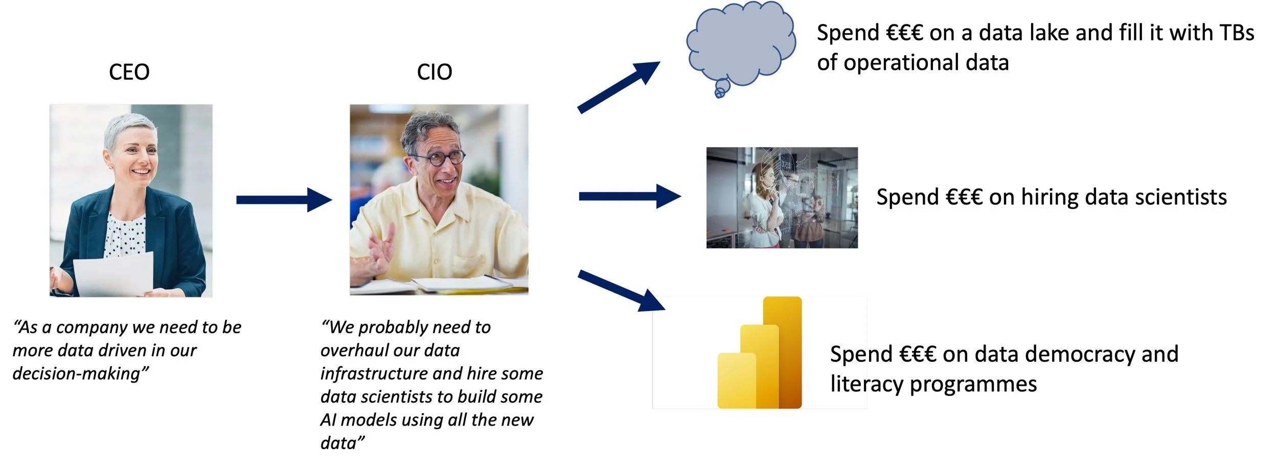 Secondly, they are non-strategic. In particular, tech/data organisation, democratisation and data literacy programmes tend to take a scatter-gun approach, focussing on high volume. Data-driven decision making is partly a cultural challenge and as with other cultural challenges, change needs to begin at the top. Why focus data literacy programmes on more junior employees, when the board and senior executives are the ones making the most expensive decisions?